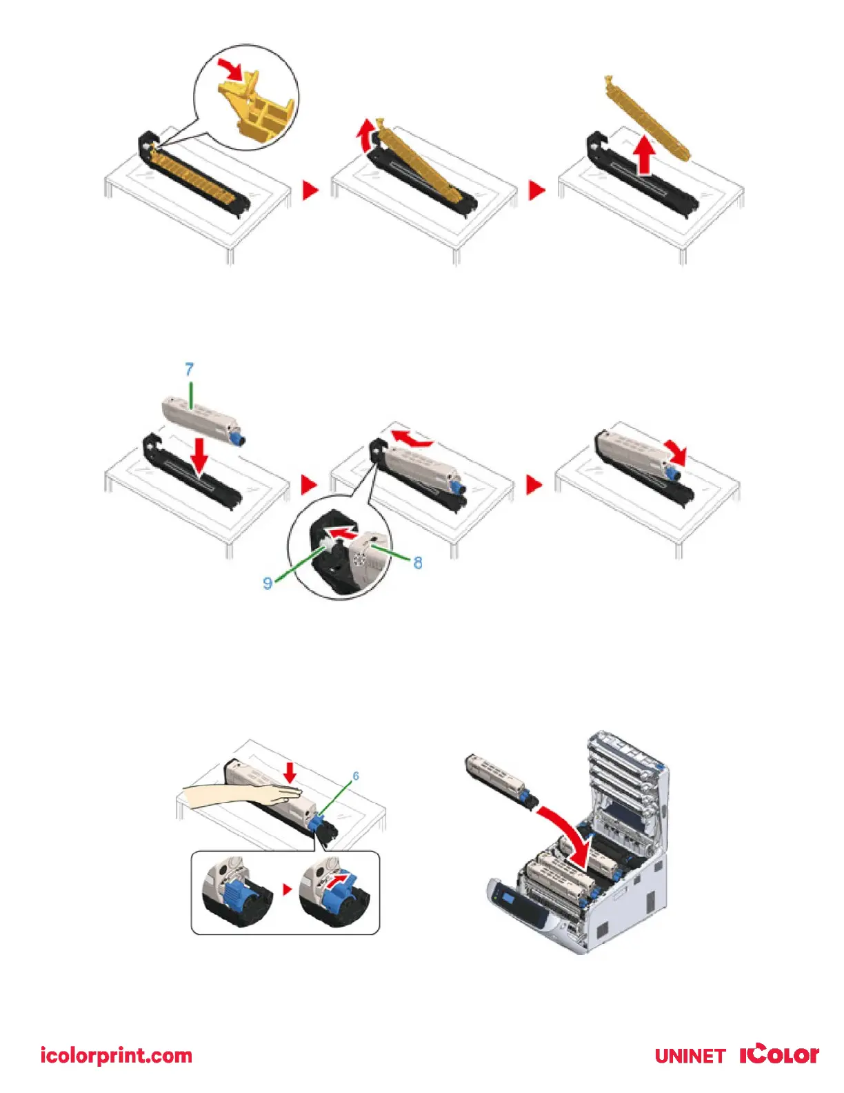 11) Insert the toner cartridge (7) removed in step 7 by aligning its left side indentation (8) with the protrusion (9) on