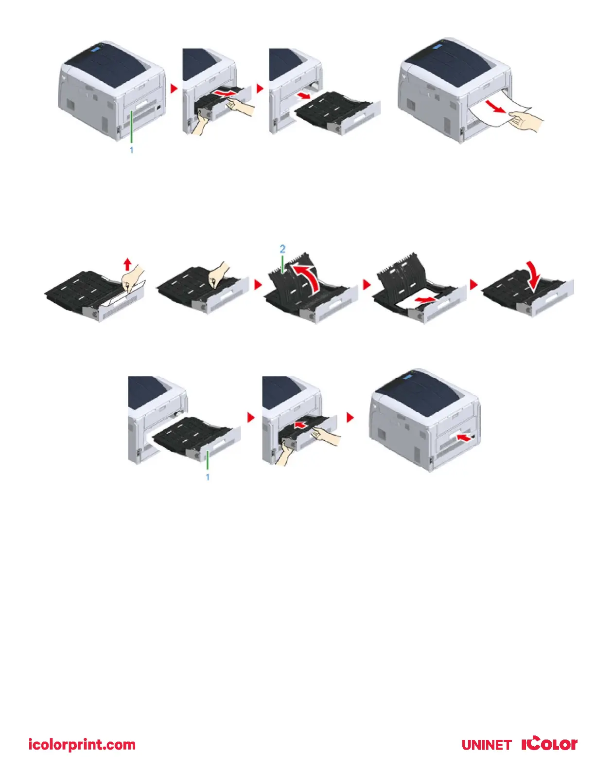 4) Open the upper duplex unit cover (2) and check for jammed paper. If jammed paper remains, pull it out gently and