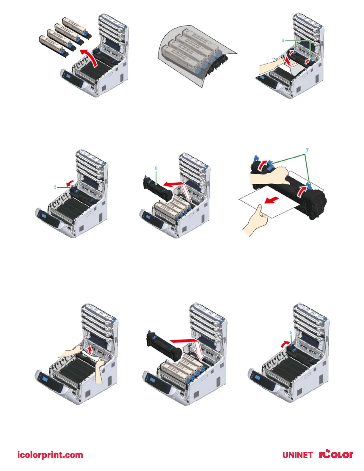 9) Hold the fuser unit handle (6) and place the fuser unit into the printer.