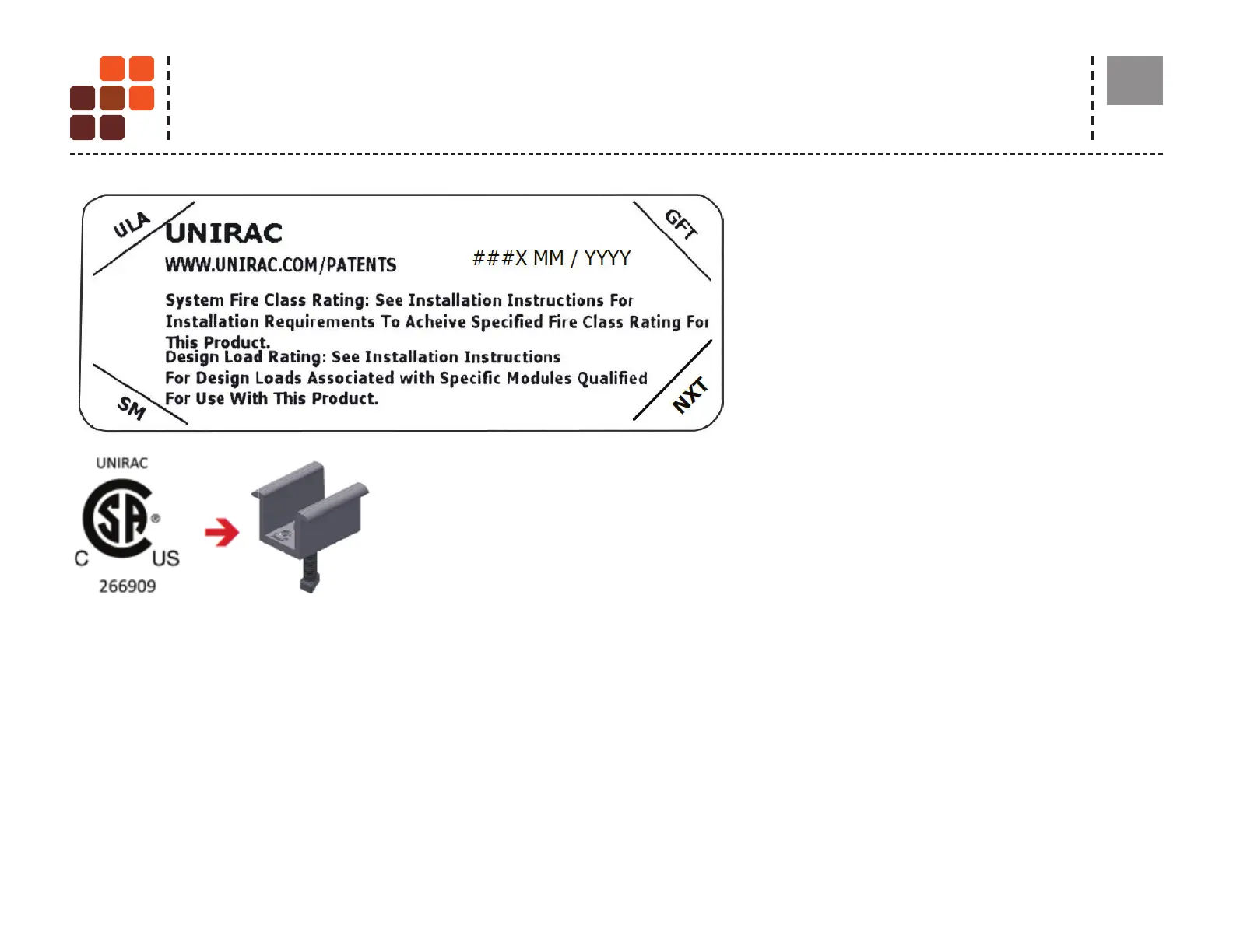 UL2703 CERTIFICATION MARKING LABEL Unirac ULA is listed to UL 2703. Certi cation marking is