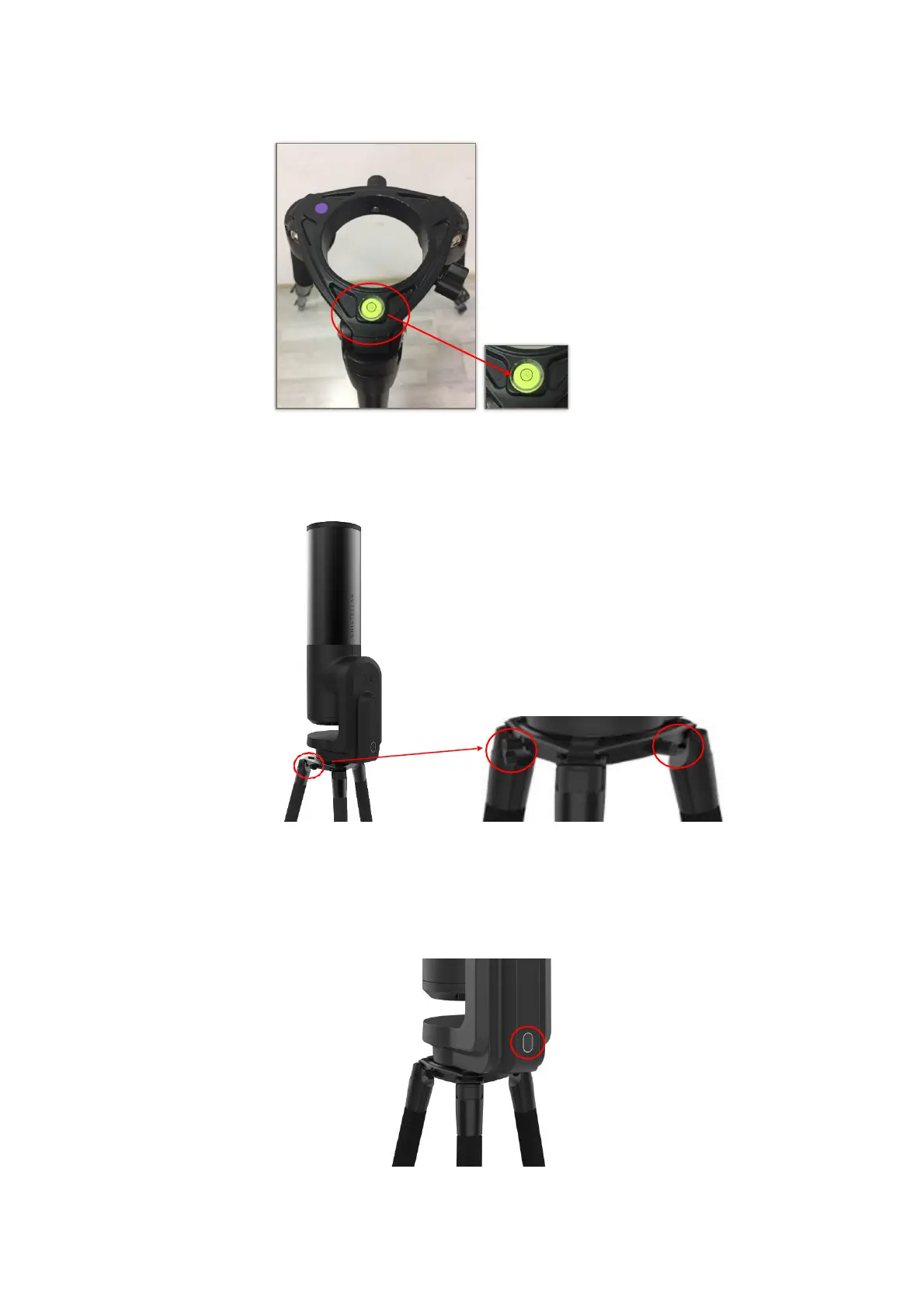 2. Adjust the legs to put the bubble level in the middle of the black circle, as in the image.