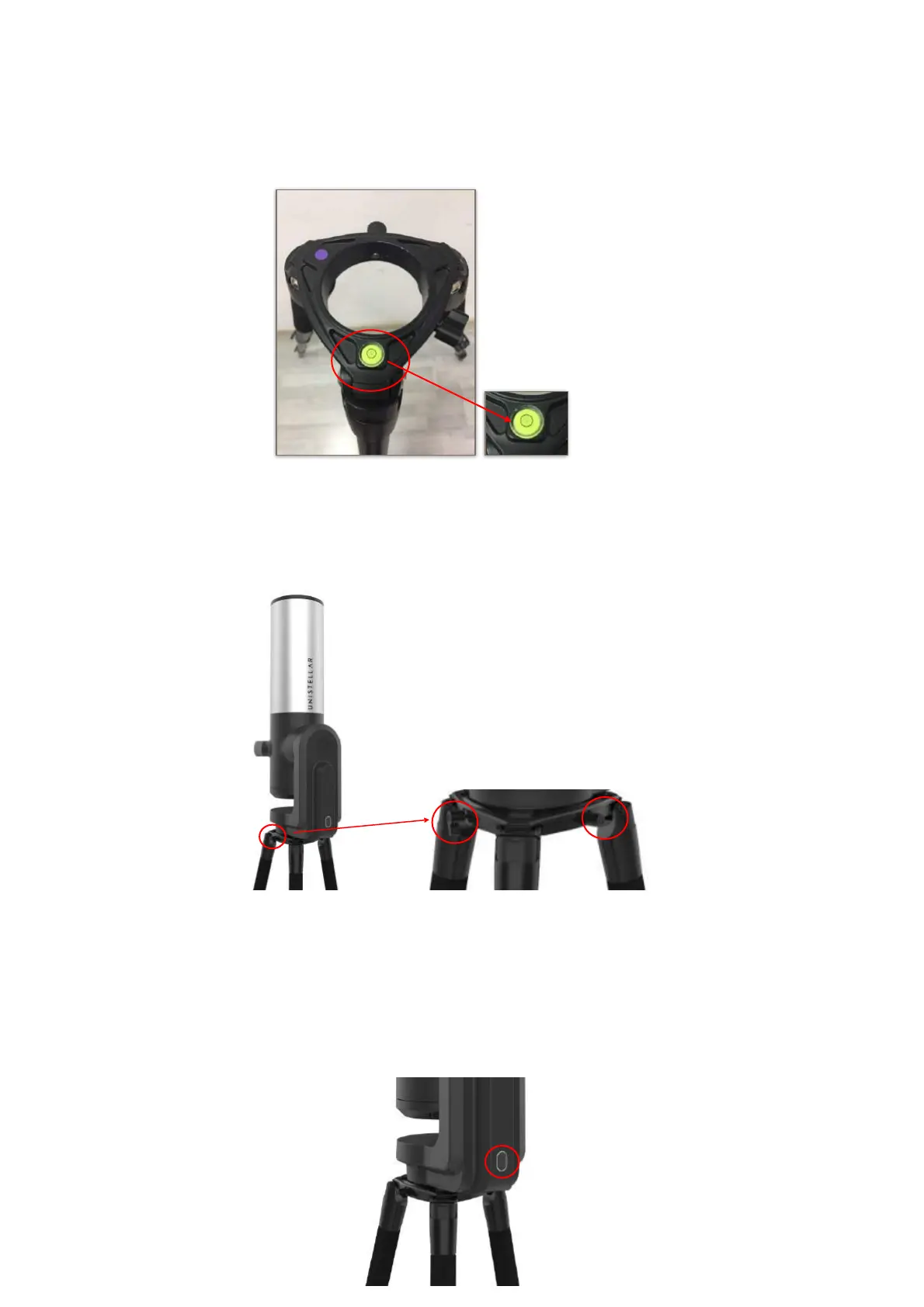 2. Adjust the legs in order to put the level bubble in the middle of the black circle, as in the