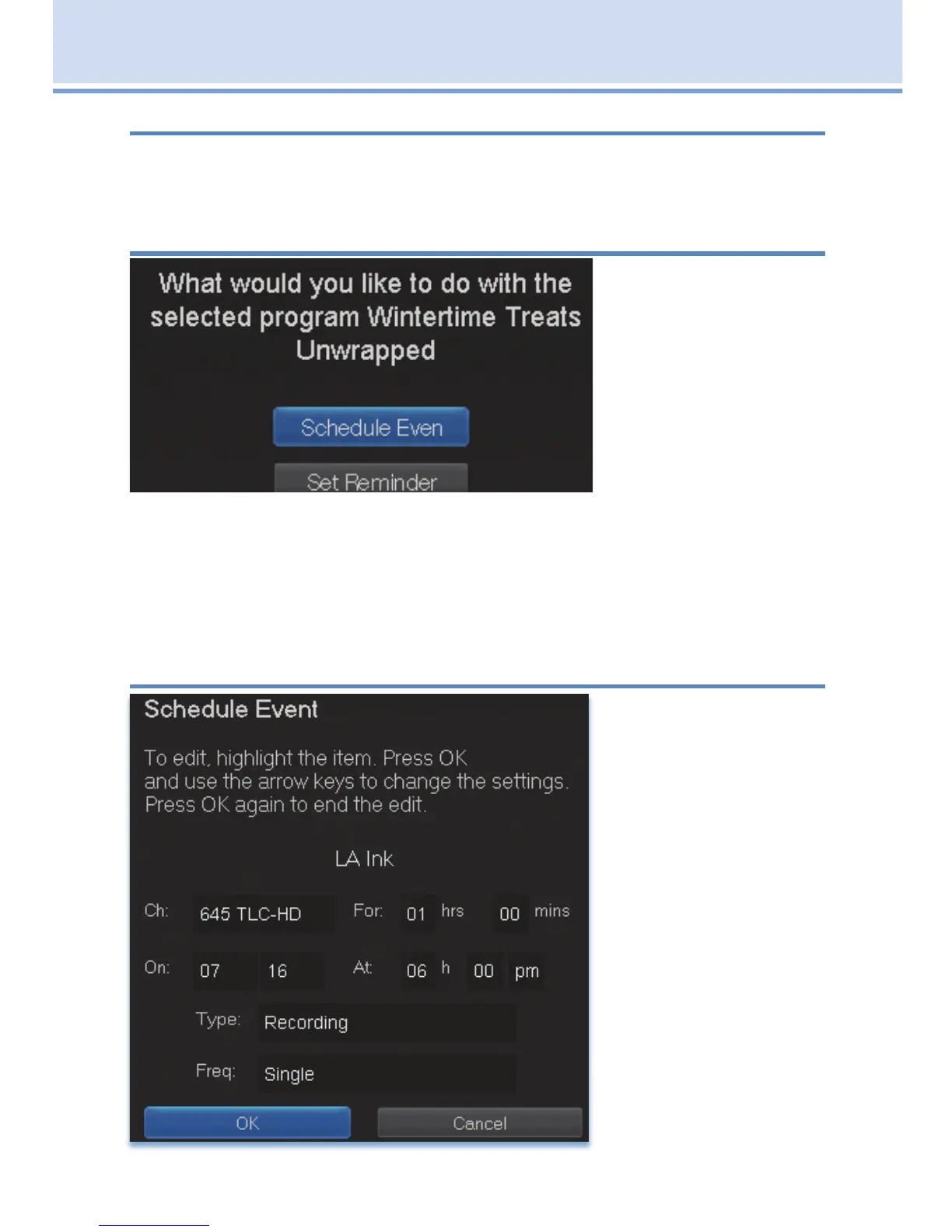 With Schedule Event, you can select the channel, date, start and stop