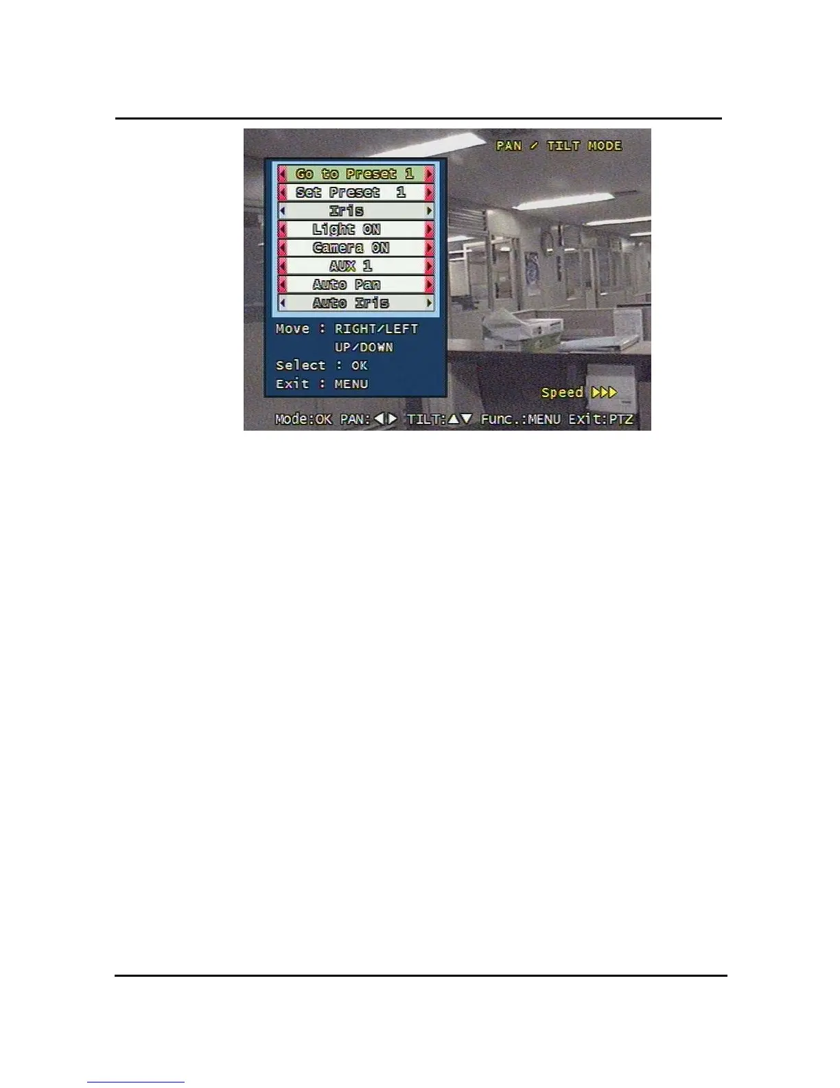 - Auto Pan : To automatically pan the camera. Pan speed is selected by Left/Right and