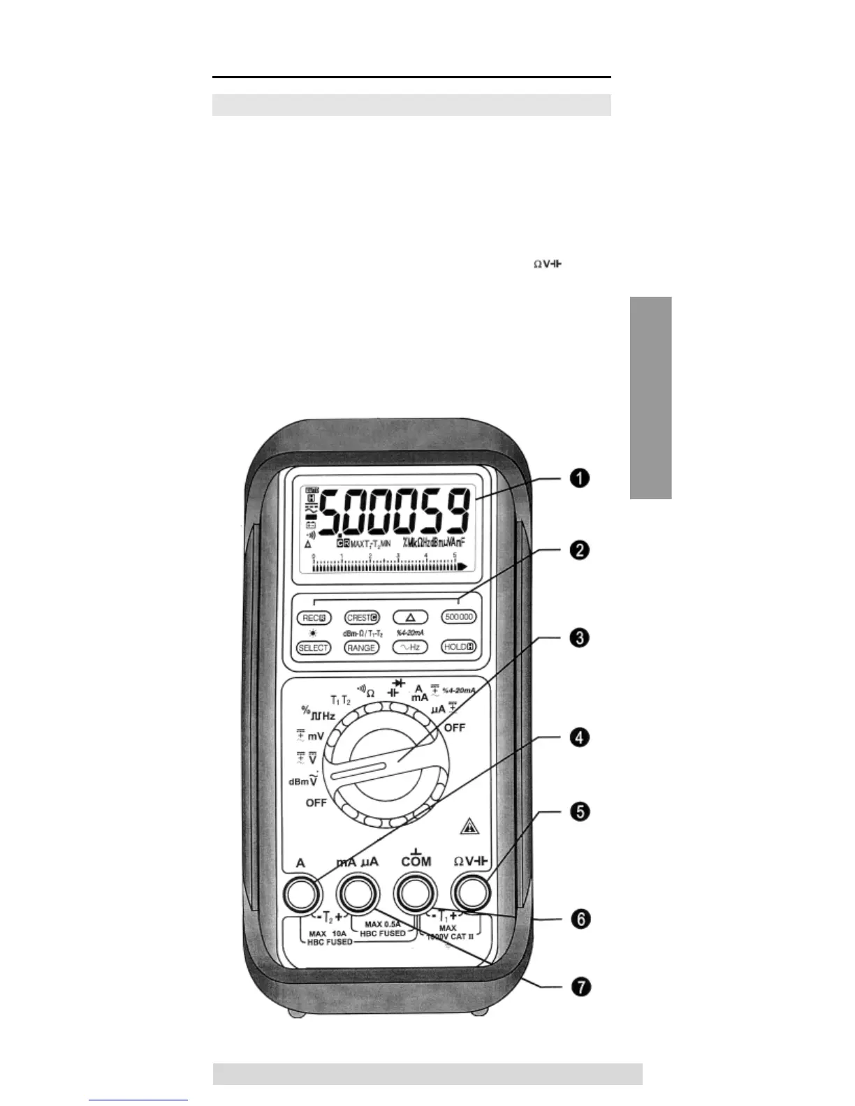 7. Input socket for mA, mA current ranges