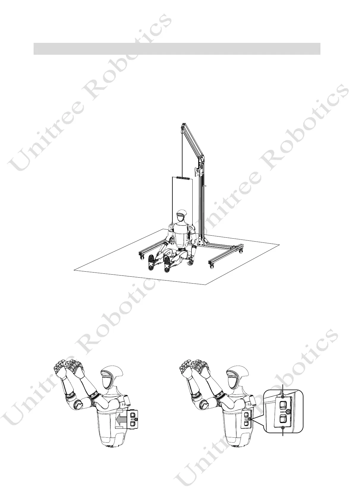 frame, gradually raise G1 by adjusting the support, ensuring that the robot's body is completely suspended and