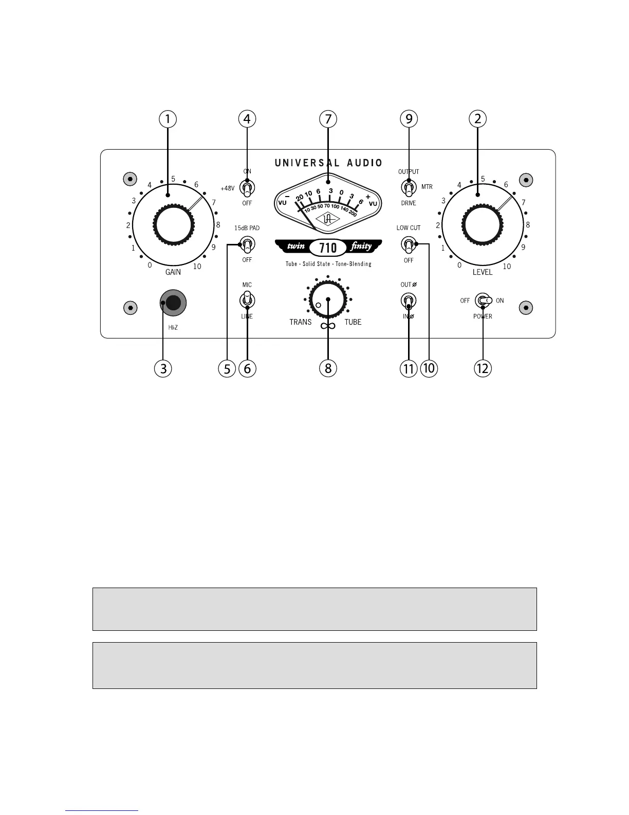 (1) Gain - Adjusts the gain of the input stage. Turning this knob clockwise raises the amount of gain