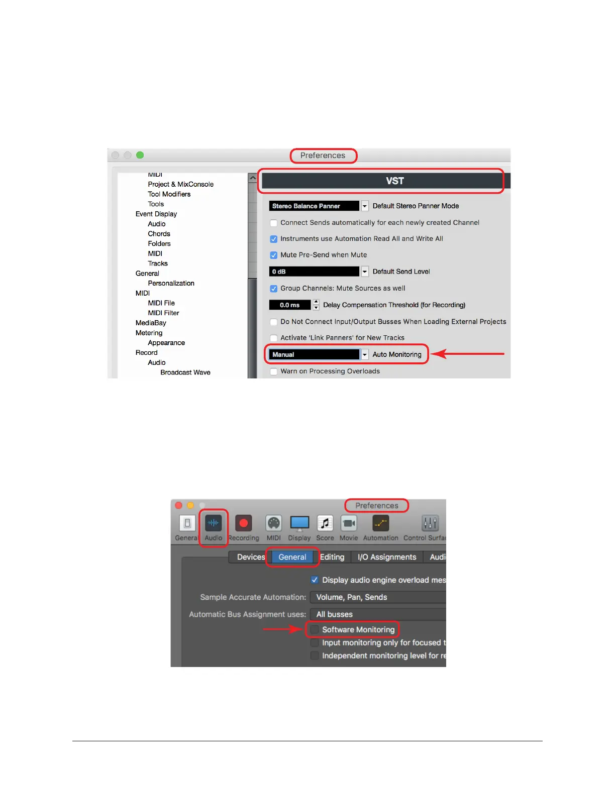 Cubase: Set Auto Monitoring to Manual in VST preferences