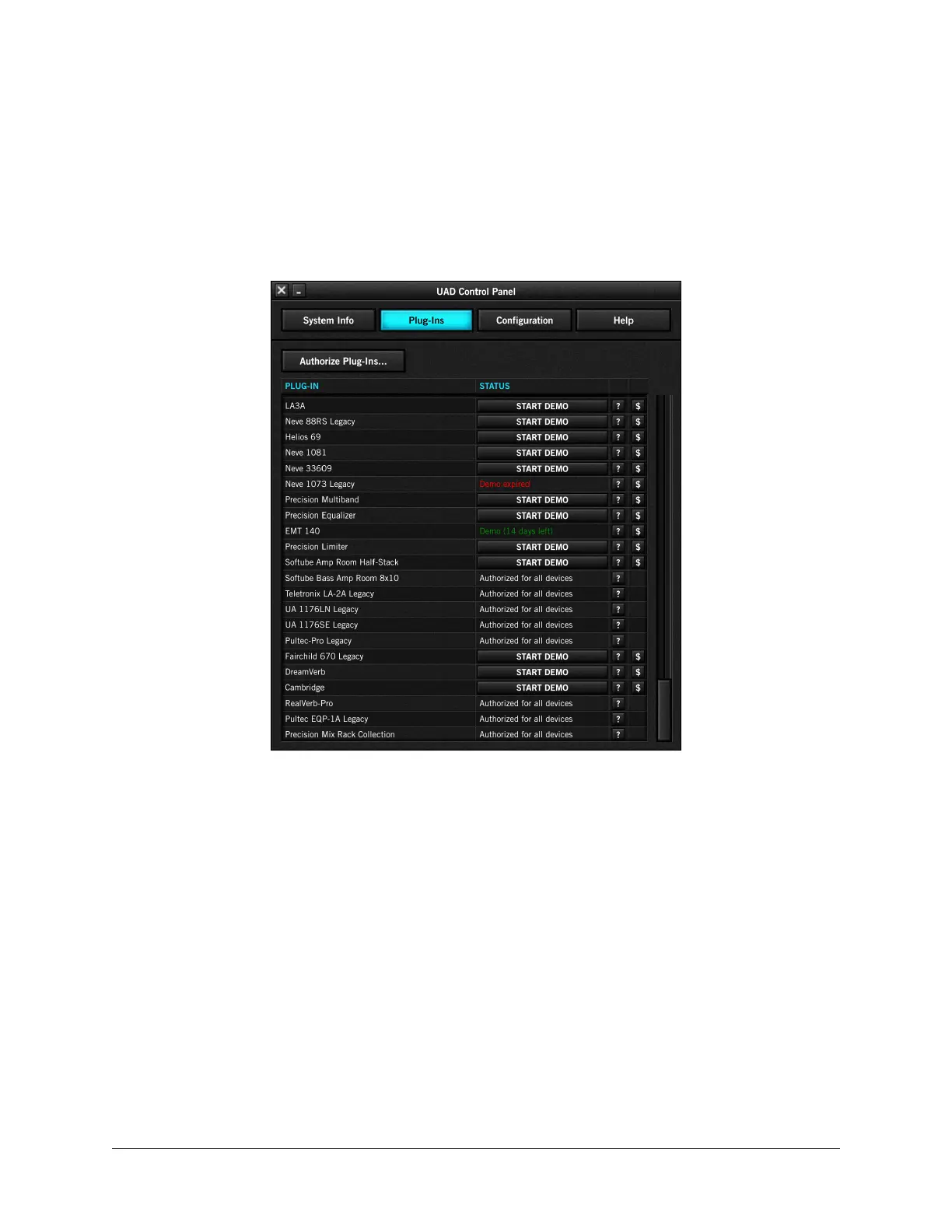 The Plug-Ins panel displays the current authorization and demo status of all installed