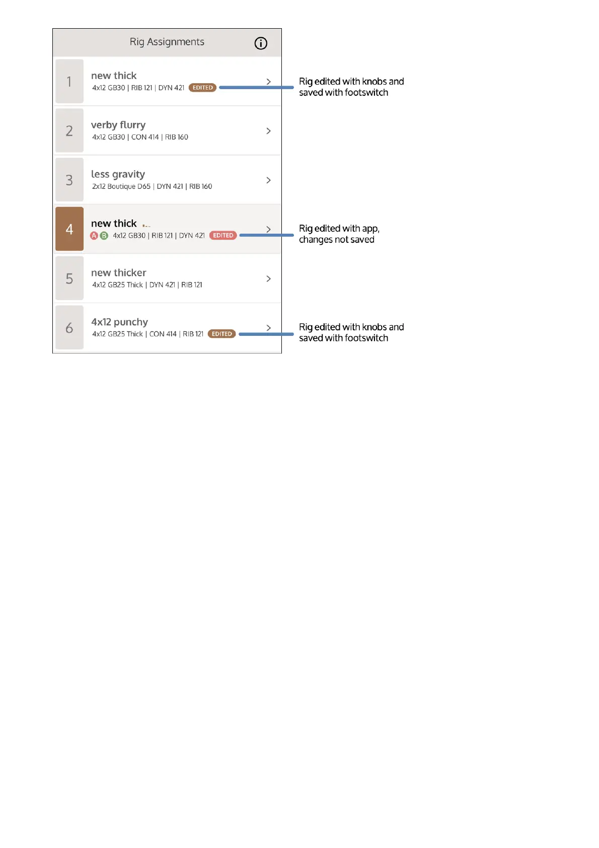 Rigs or power off the pedal, and the changes will remain; however, the Rig continues to show as
