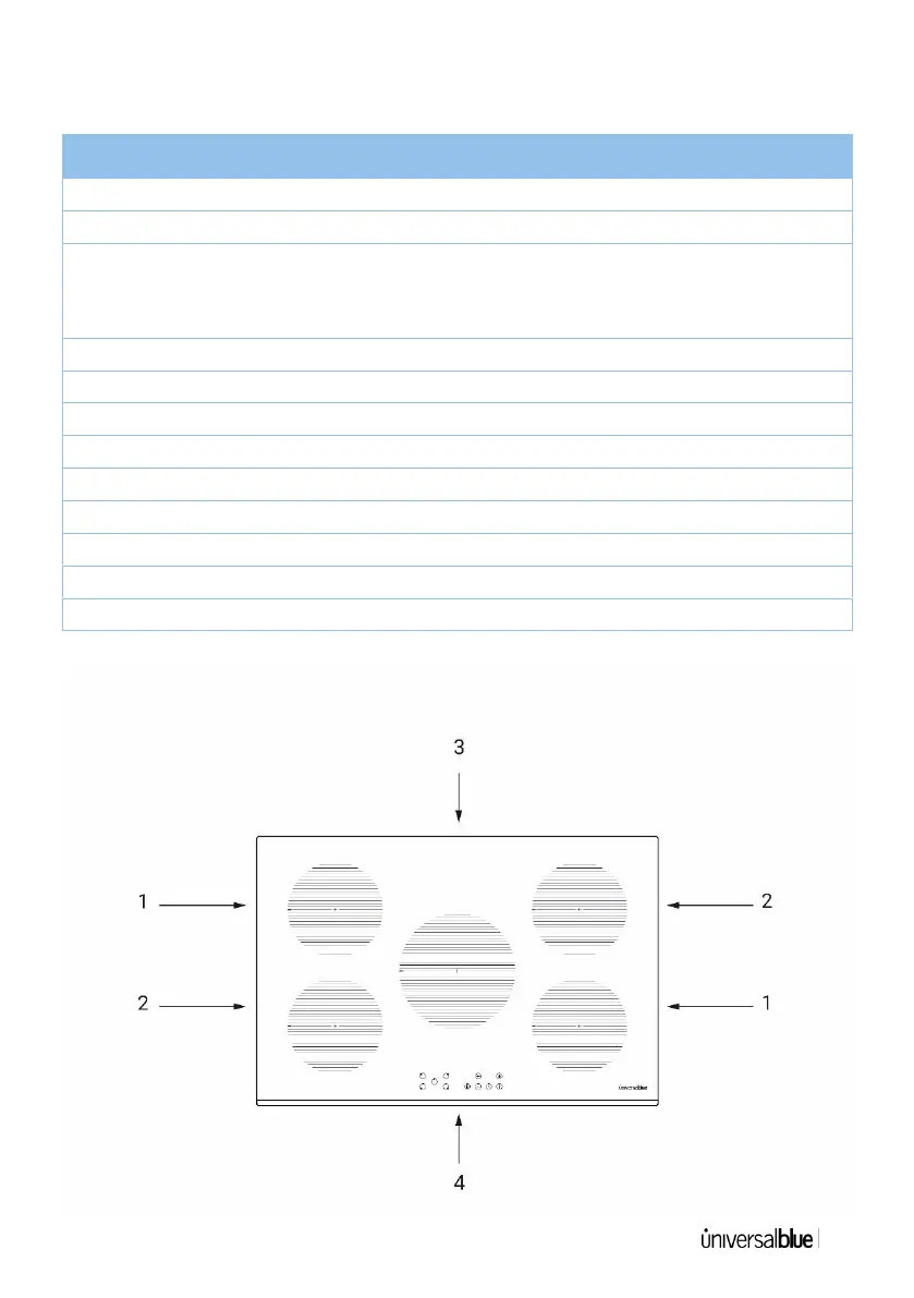 Cooking zones: 1= 18 cm / 1500-1800W, 2= 18 cm /2000-2300W,