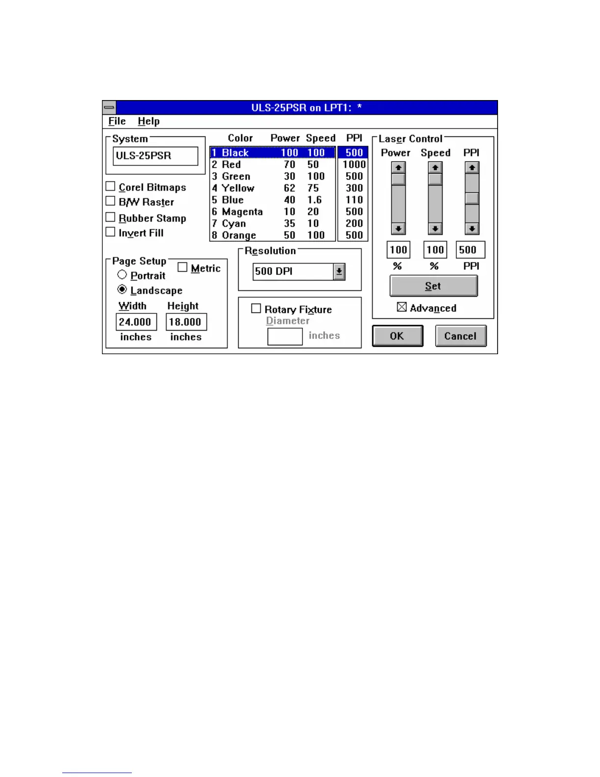 To change the POWER, SPEED, and PPI of a color, position the mouse arrow on the color and