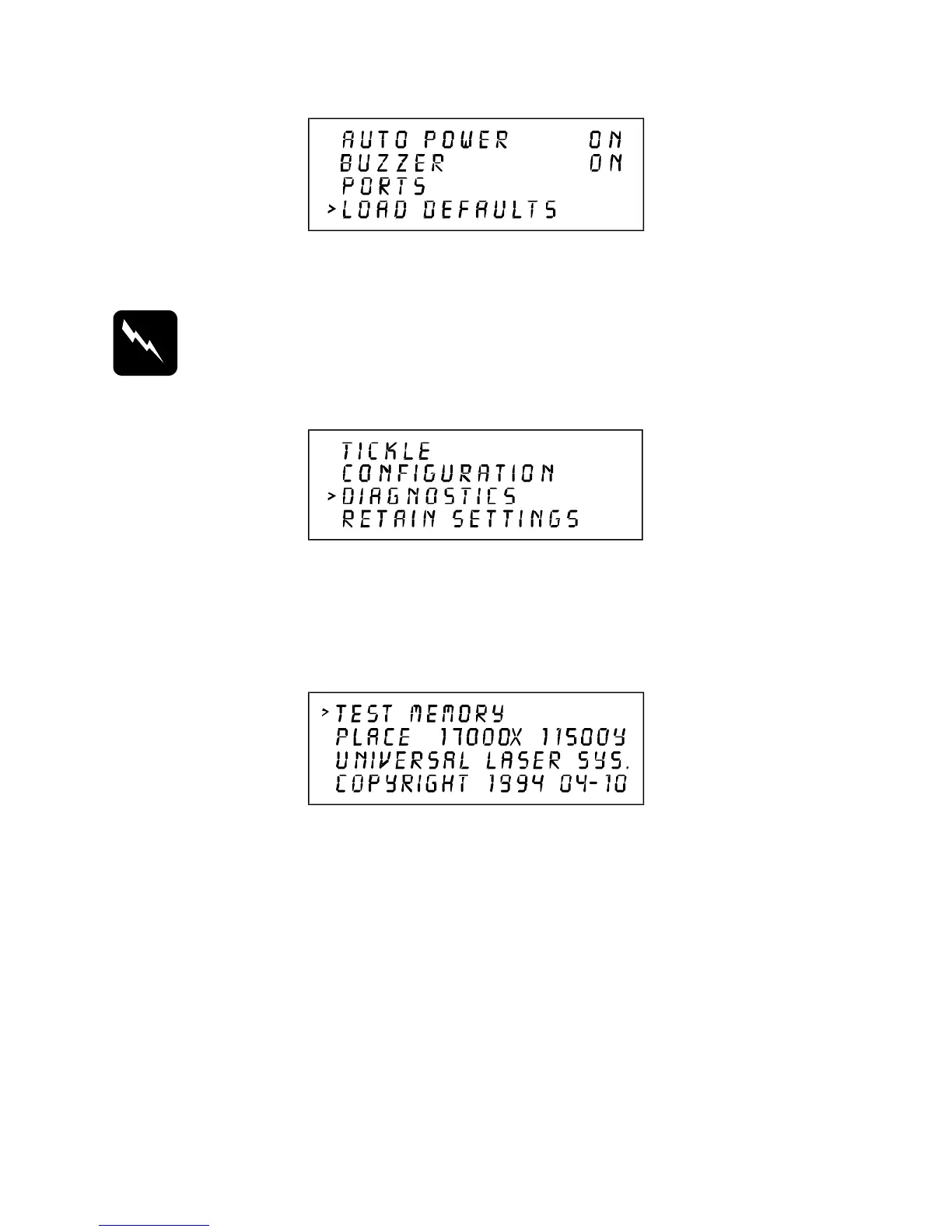 The DIAGNOSTICS selection allows the testing of certain features of the engraving system. Selecting