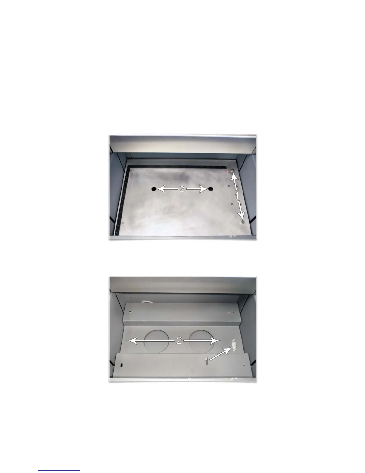 3. Remove the engraving table by loosening the two captive thumbscrews (1). Then, using the finger holes