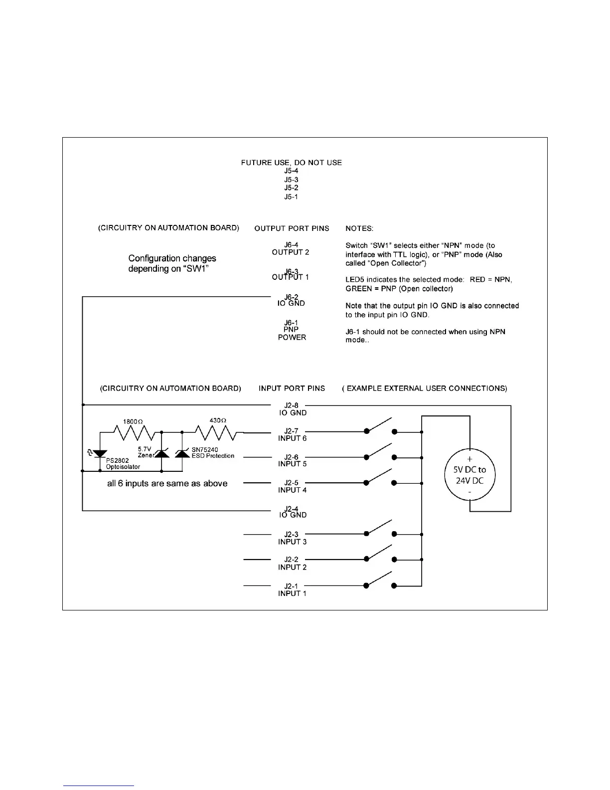 modes, selectable by the “PNP/NPN” switch on the top of the board. LED 5 indicates the position of this