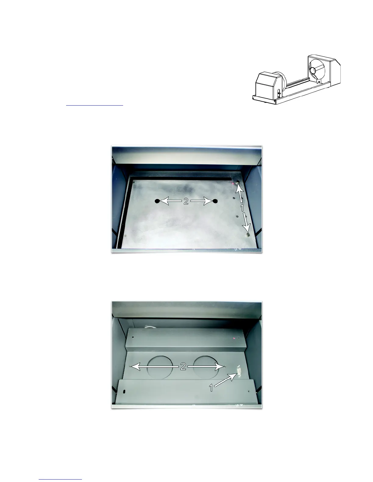 1. Remove the engraving table by loosening the two captive thumbscrews (1) and using finger holes (2) lift