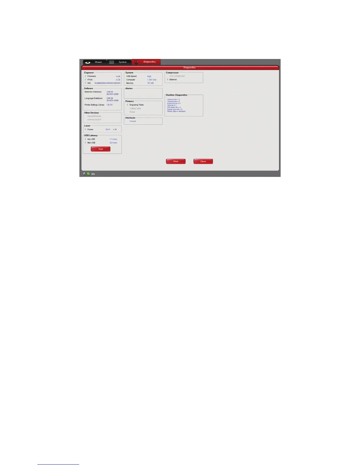 The Diagnostics Tab displays important information about your laser system and personal computer. This information