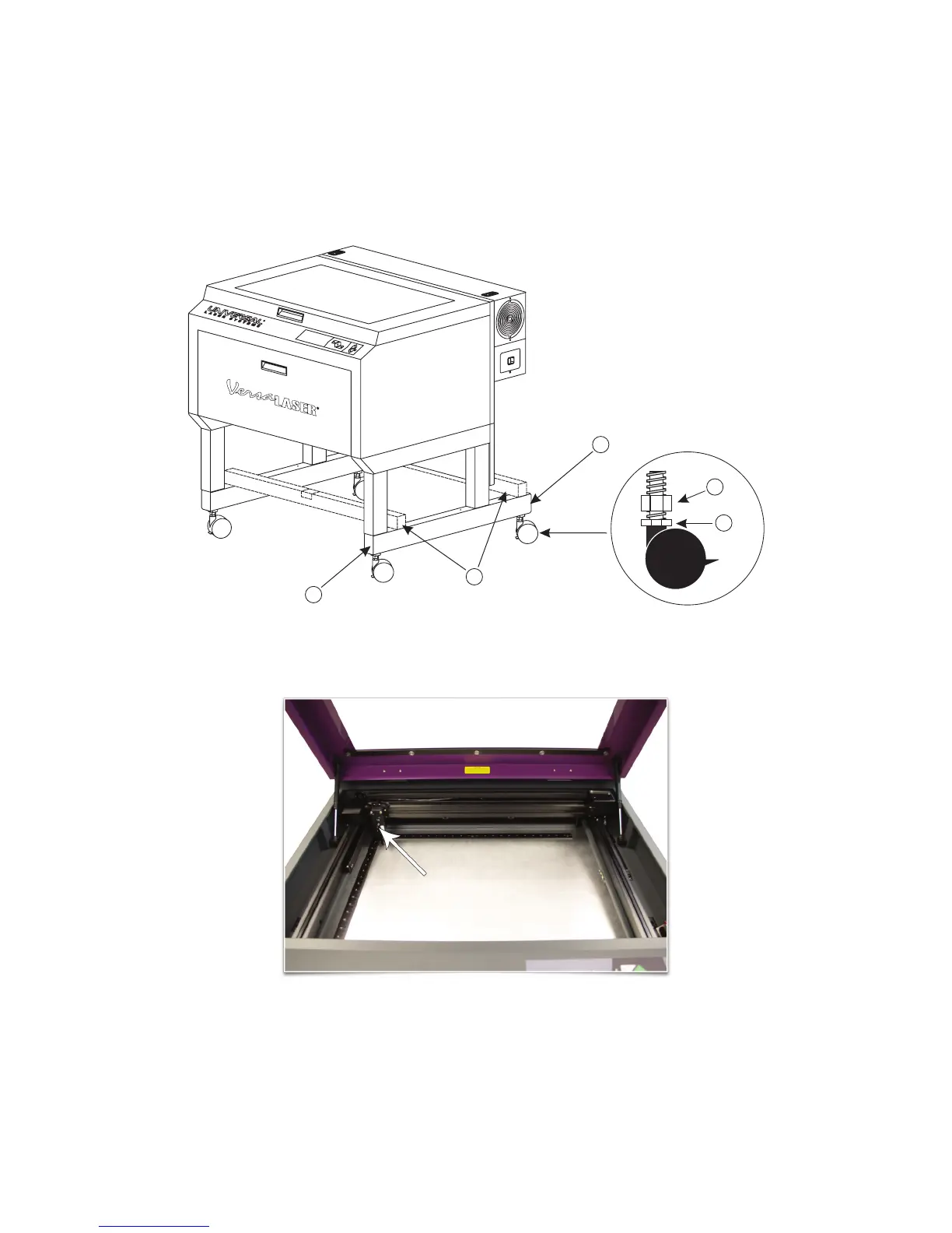 Place a bubble level (1) across the front (2) and rear cart legs (3). Adjust the caster height using the adjustment 1.