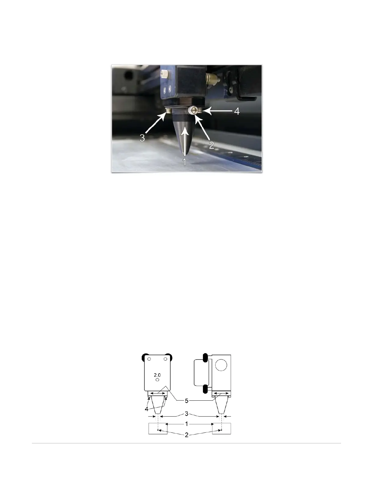 the red beam (2) in relation to the center of the bottom of the Coaxial Gas Assist Attachment (3).