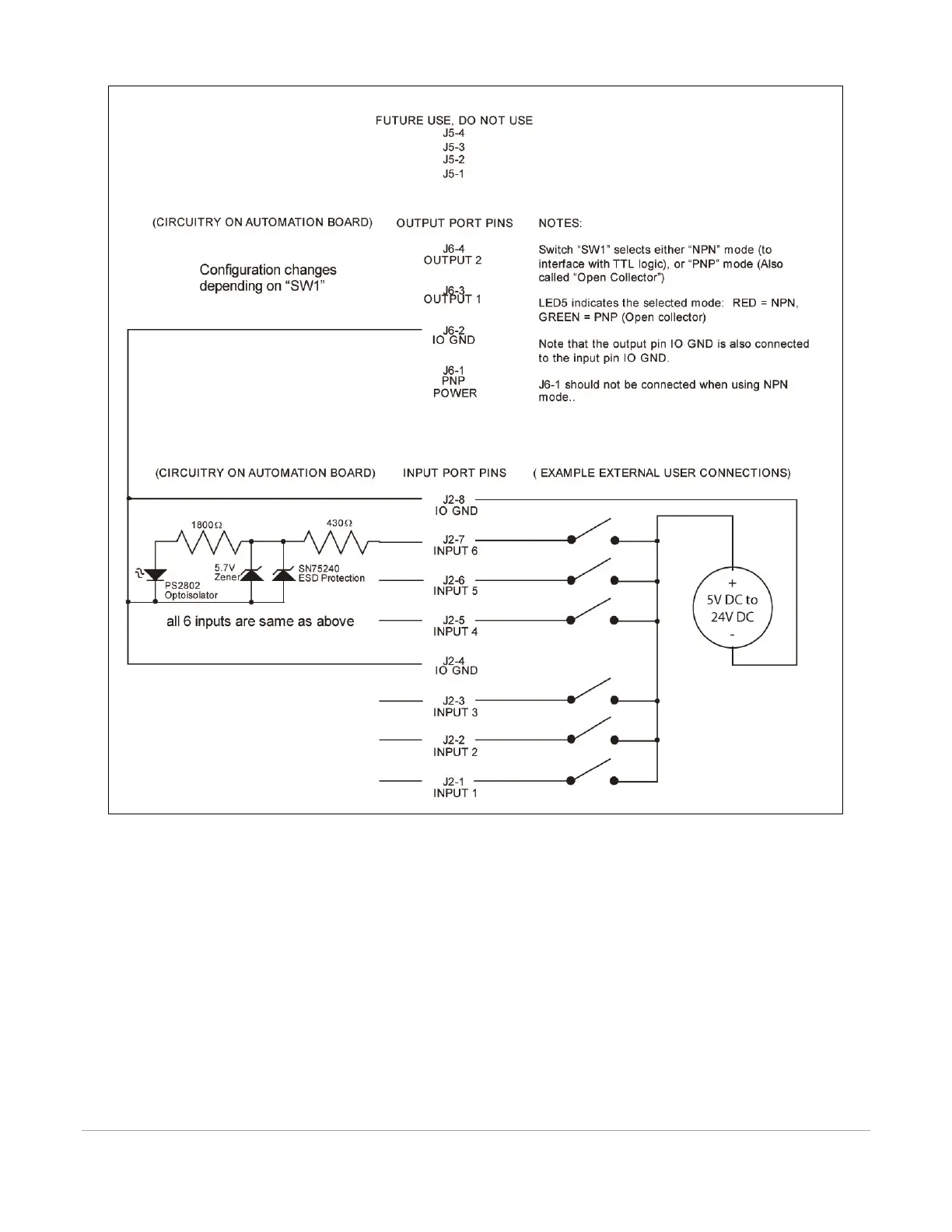 in two modes, selectable by the “PNP/NPN” switch on the top of the board. LED 5 indicates the position of