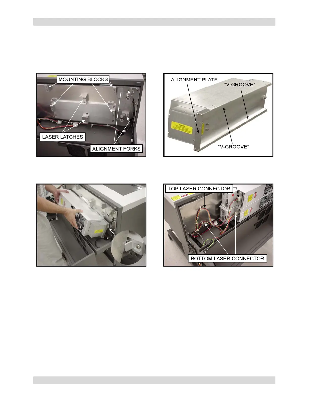 2) Locate the laser mounting blocks, the laser latches, and alignment forks. Notice that the alignment