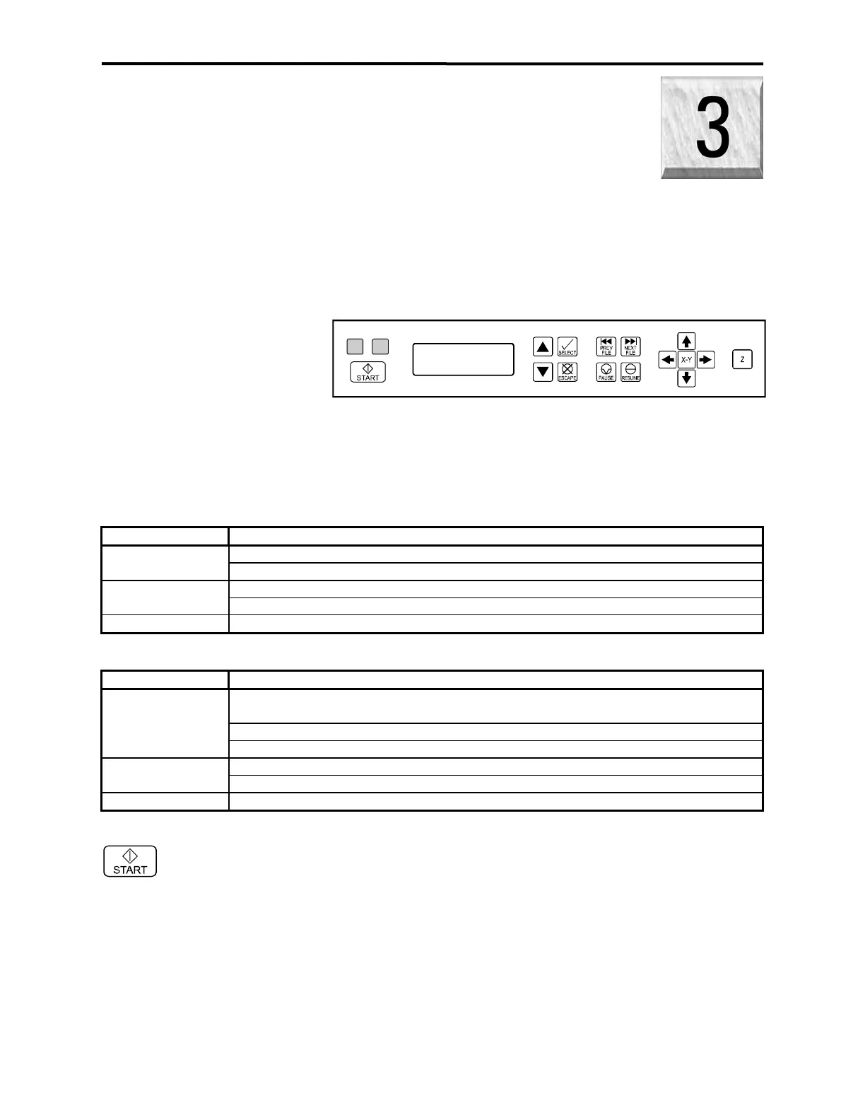 START: Begins laser processing of the current file displayed in the “FILE DISPLAY” menu. If
