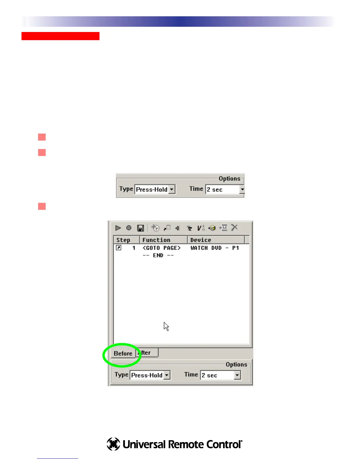 3 Click on the Tab at the bottom of the Macro Window labeled BEFORE, then program a jump to the