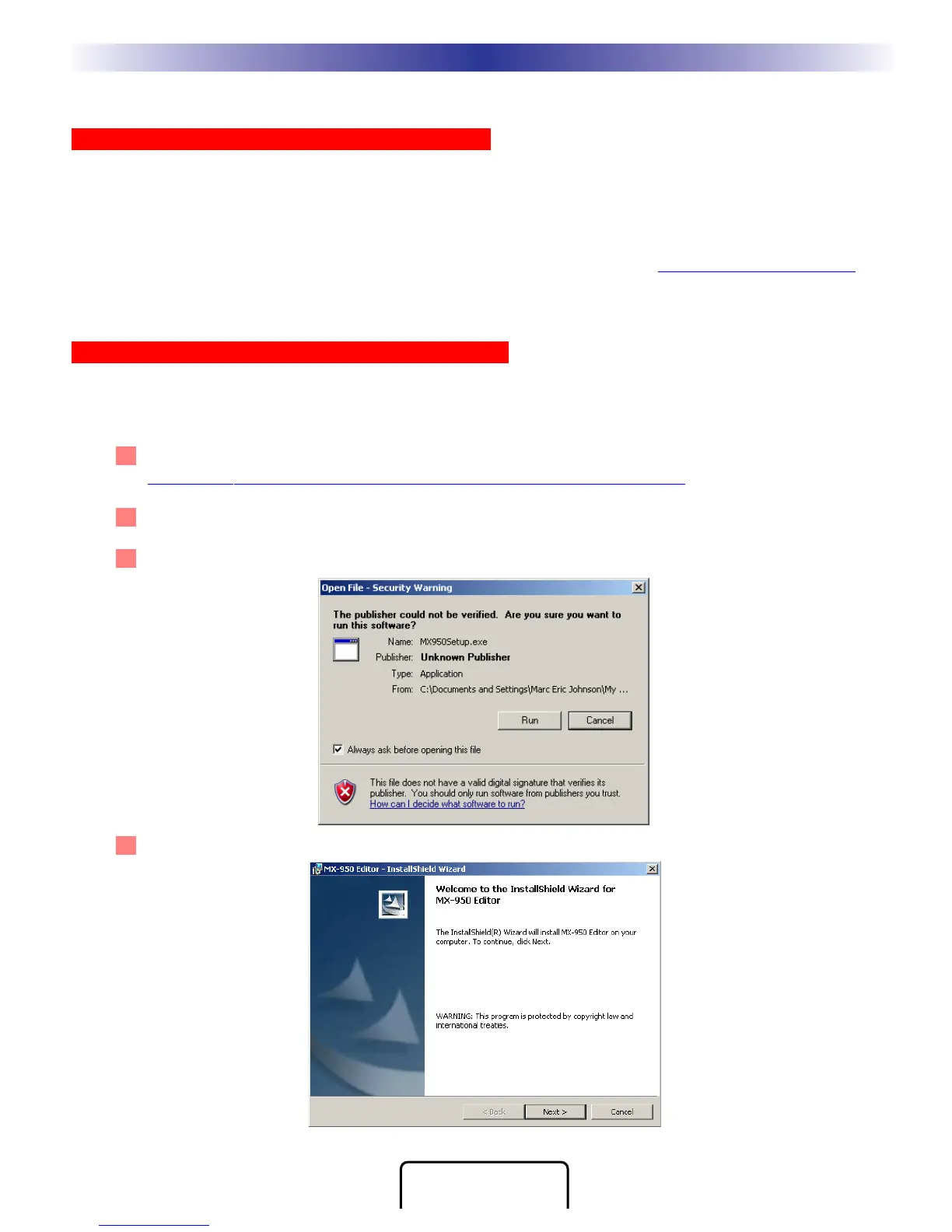 MX-950 Editor is installed via a self extracting installer file downloadable from www