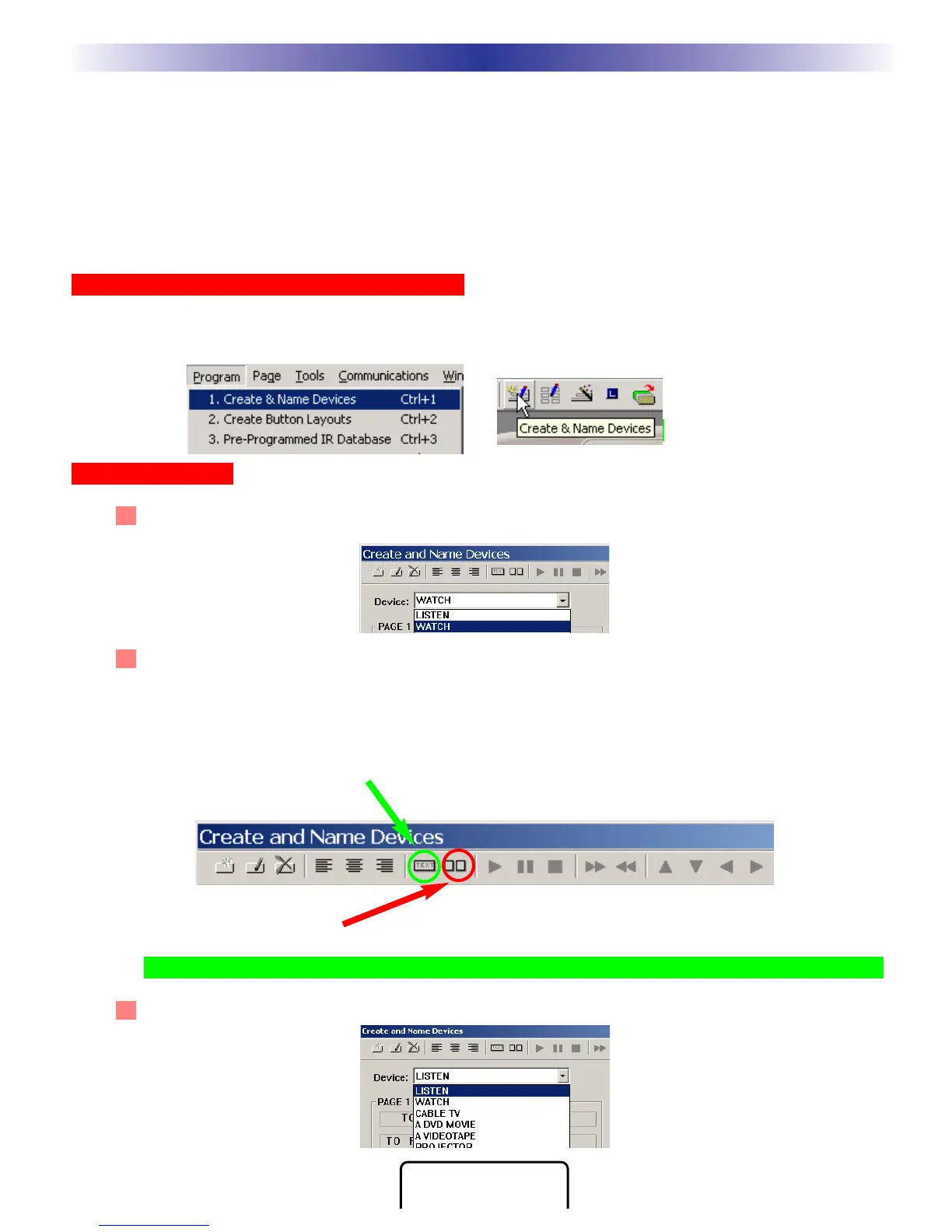 1 After the Create and Name devices window appears, select the WATCH or the LISTEN menu from