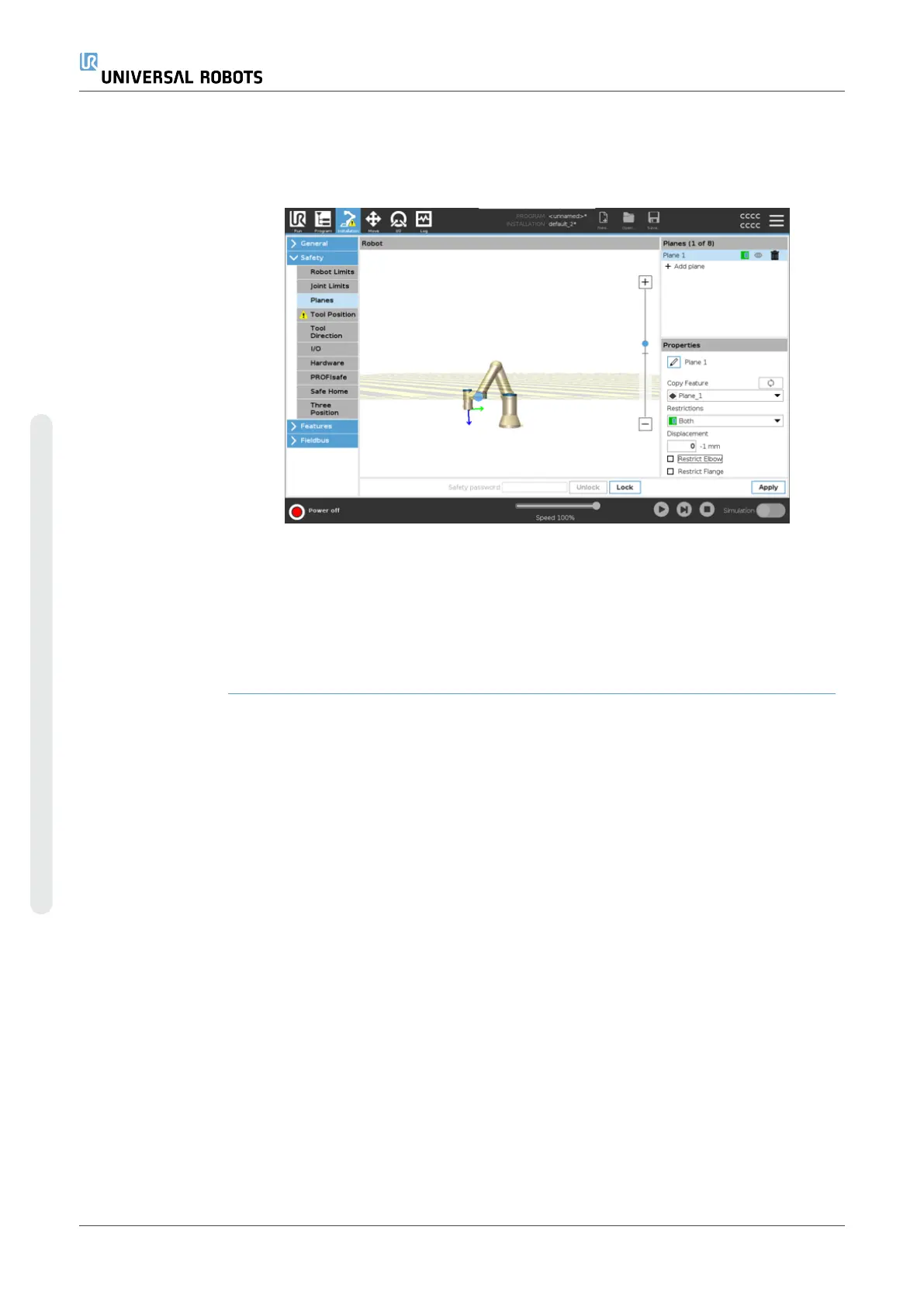 The unrestricted tool flange can cross a safety plane, even when no tool is defined.