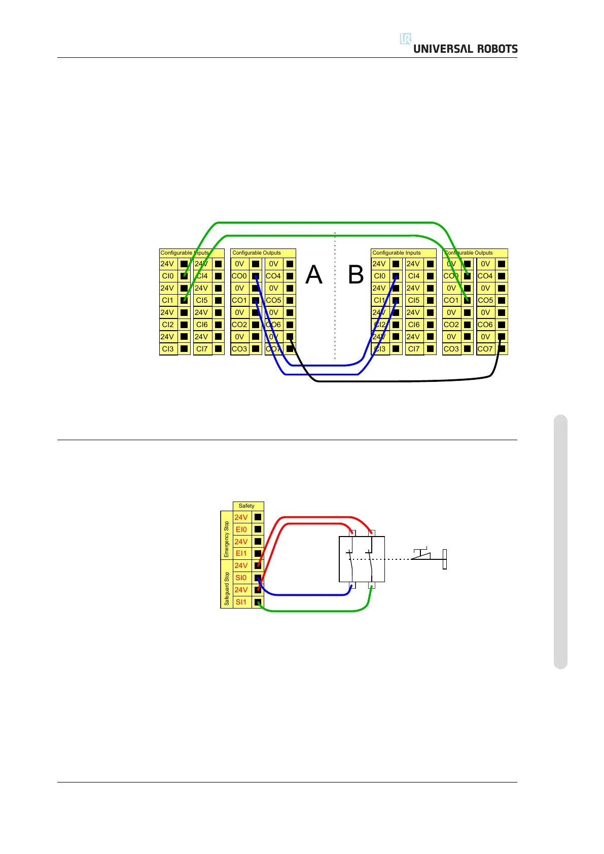 The illustration below shows how two UR robots share their emergency stop func-