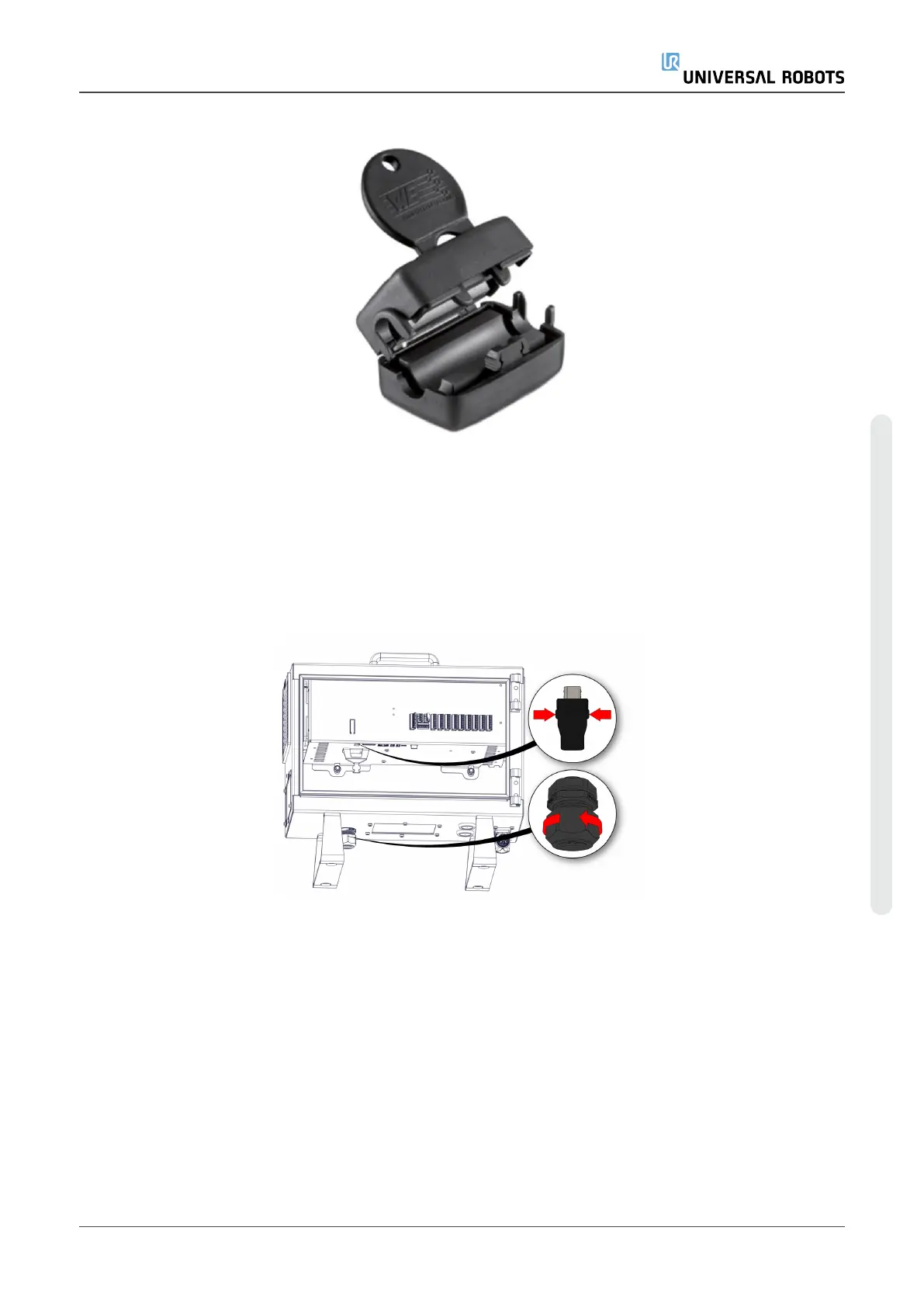 5. Press in the clips on both sides of the TeachPendantplug, as illustrated below, and pull