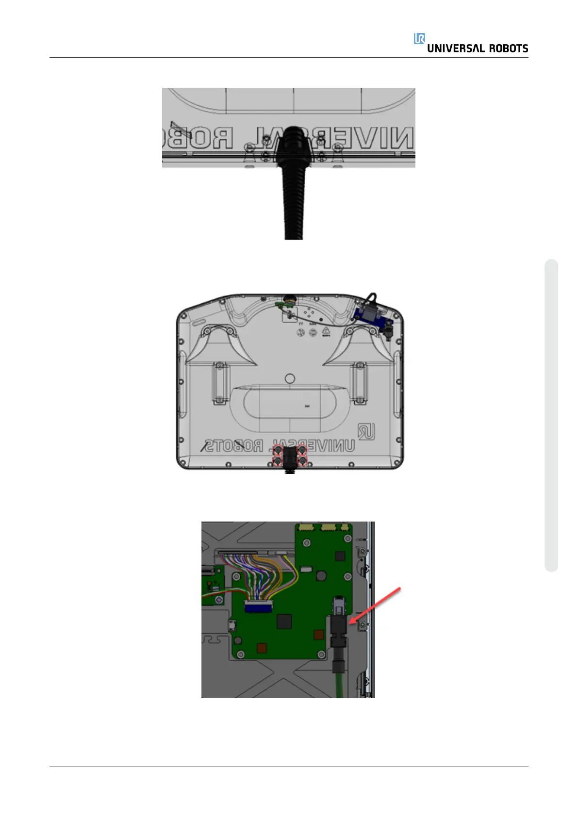 8. Find the new Teach Pendant cable from the kit. Pull it through the hole the back plate. Make
