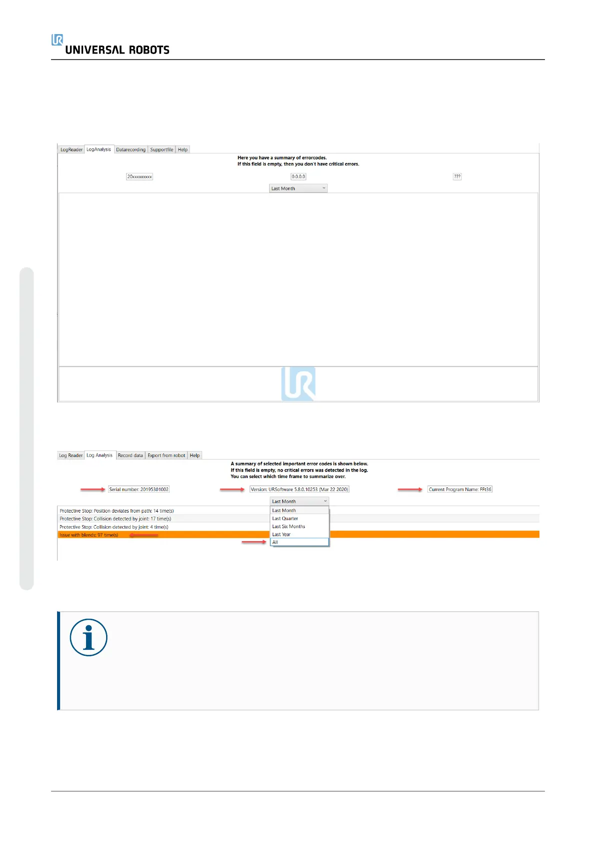 The Serial Number of the robot, the robot software current version, and the last program running on