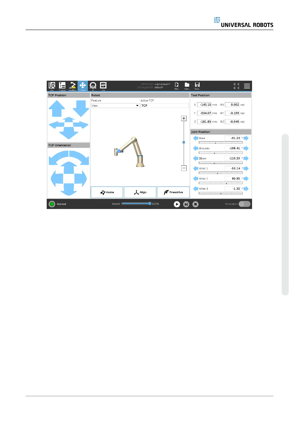 On this screen, you can move (jog) the robot arm directly, either by translating/rotating the robot