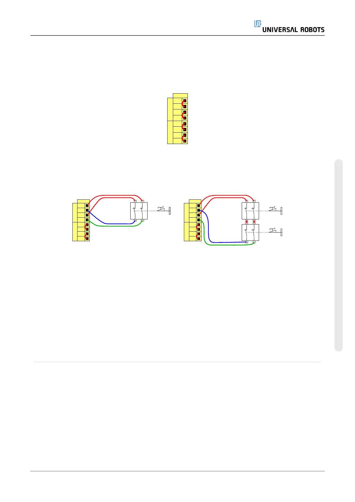 The illustration below shows how two UR robots share their emergency stop functions. In