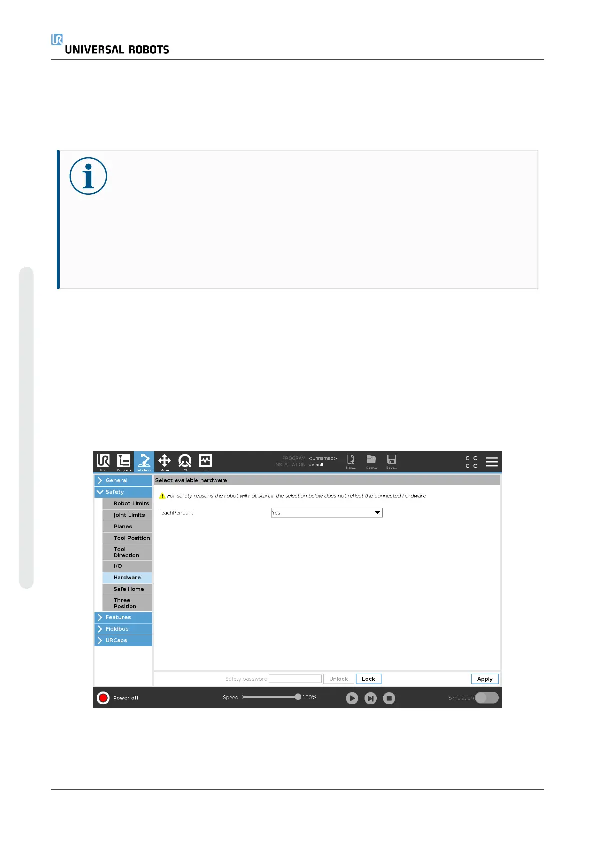 3. On PolyScope, in the Header, tap Installation and select Safety.