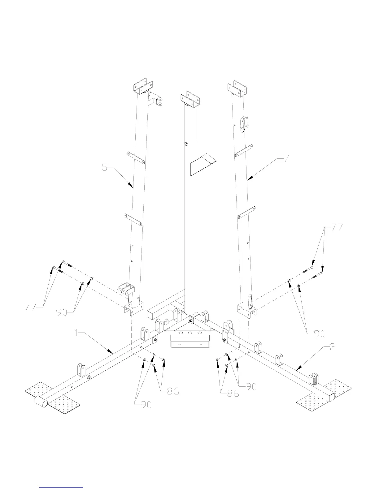 Attach LEFT VERTICAL FRAME (7) to LEFT BASE BEAM (2) with 3/8” x 3” HEX BOLTS (77), 3/8” WASHERS (90) and