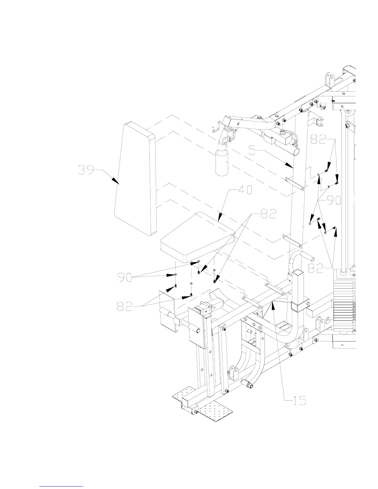 Attach SEAT CUSHION (40) to SEAT SUPPORT FRAME (15) with 3/8” x 3/4” HEX BOLTS (82) and 3/8” WASHERS