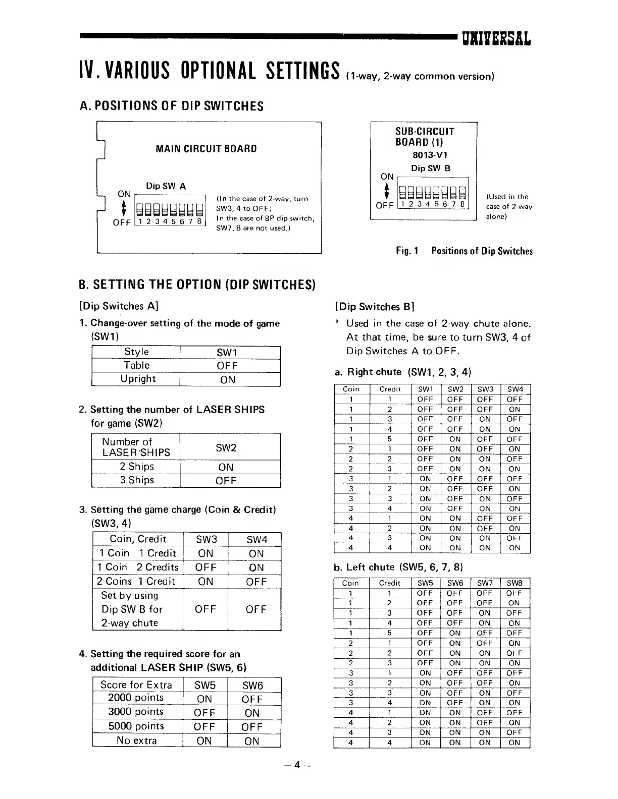 Universal COSMIC SERIES - IV. VARIOUS OPTIONAL SETTINGS; A. POSITIONS OF DIP SWITCHES; B. SETTING THE OPTION (DIP SWITCHES)