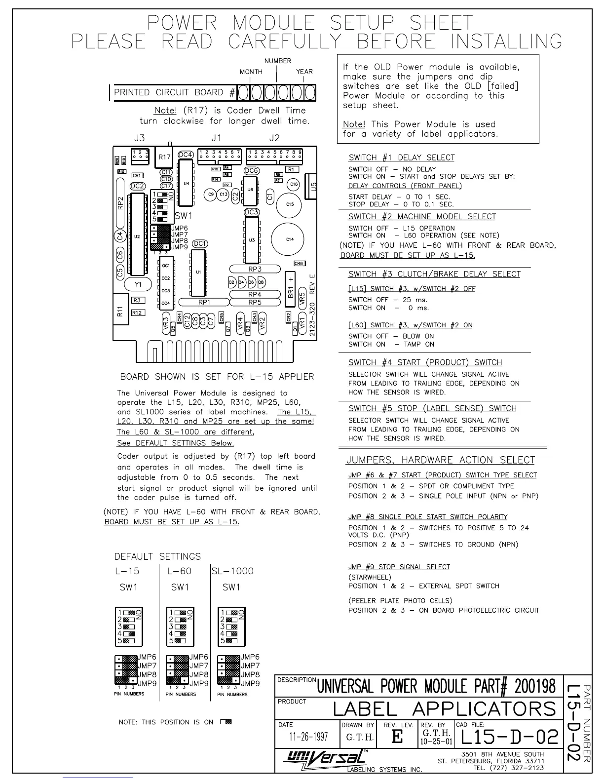 Universal L60 - POWER MODULE SETUP SHEET; SWITCH #1 DELAY SELECT; SWITCH #2 MACHINE MODEL SELECT; SWITCH #3 CLUTCH;BRAKE DELAY SELECT