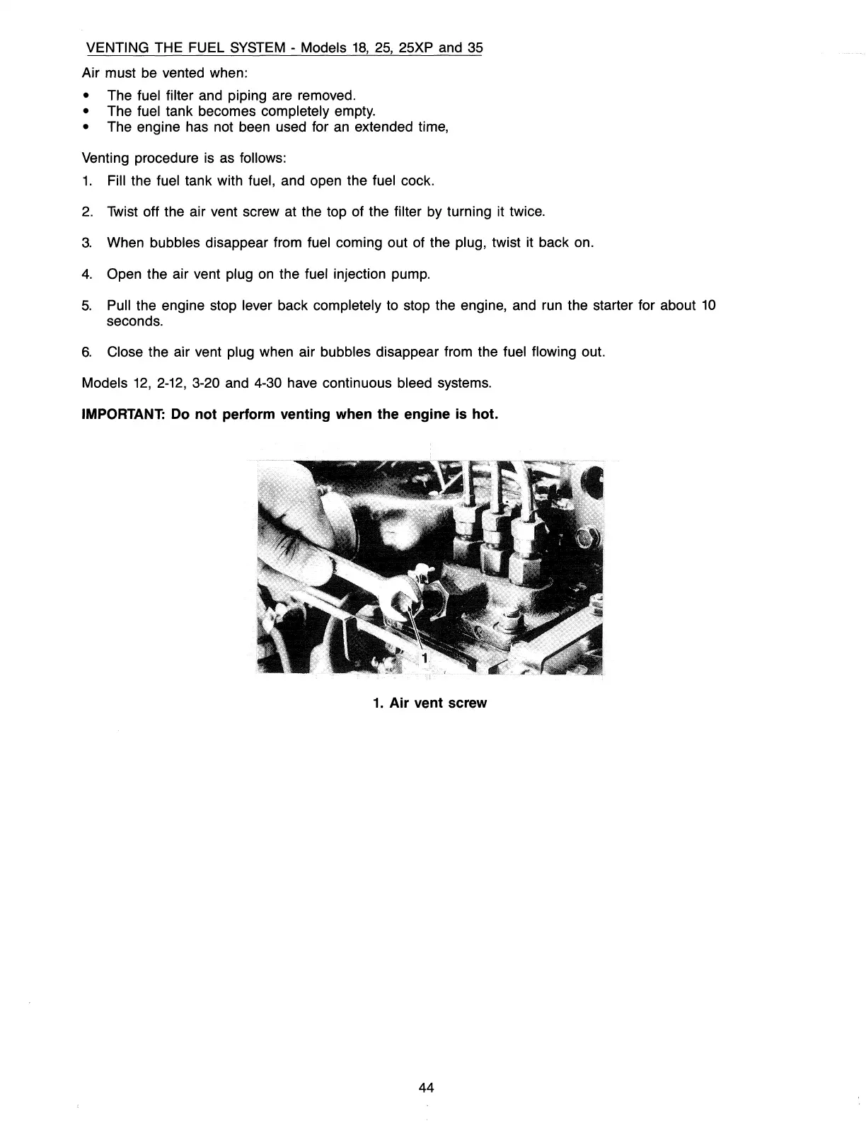 Close the air vent plug when air bubbles disappear from the fuel flowing out.