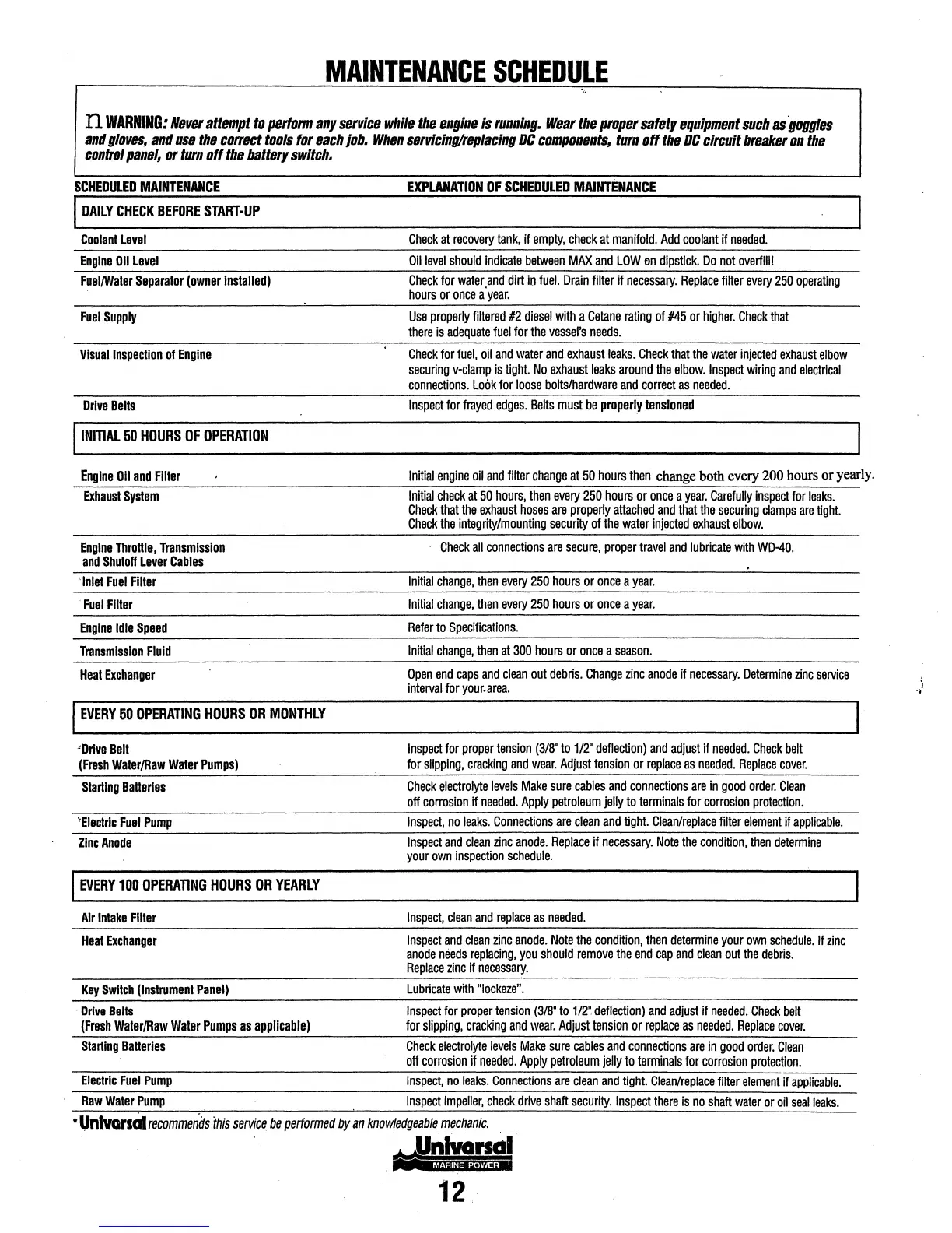 Universal M-25XPB(C) - SCHEDULED MAINTENANCE ITEMS; DAILY CHECK BEFORE START-UP; INITIAL 50 HOURS OF OPERATION; EVERY 50 OPERATING HOURS OR MONTHLY