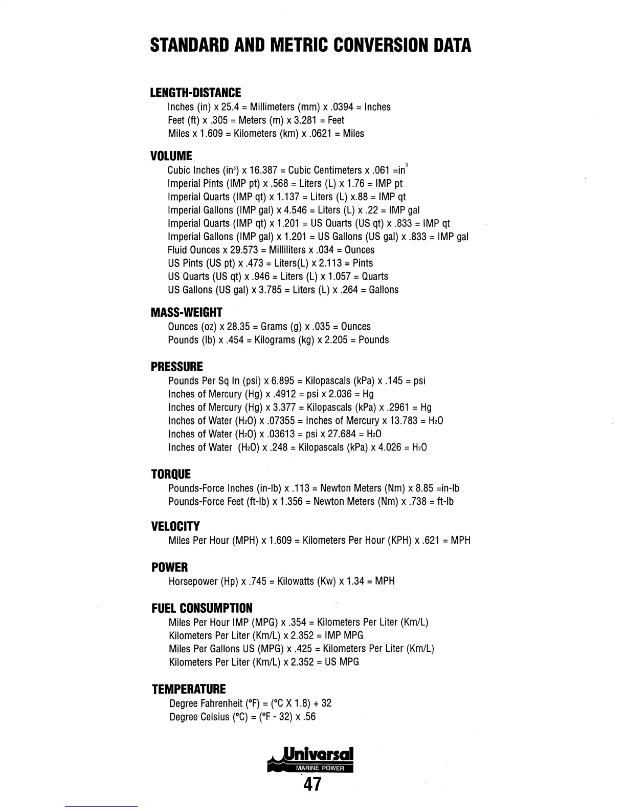 Universal M-25XPB(C) - METRIC CONVERSION DATA