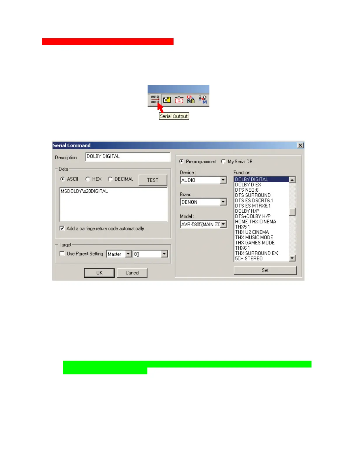 a. The SERIAL COMMAND WINDOW will appear. Embedding a RS232 command