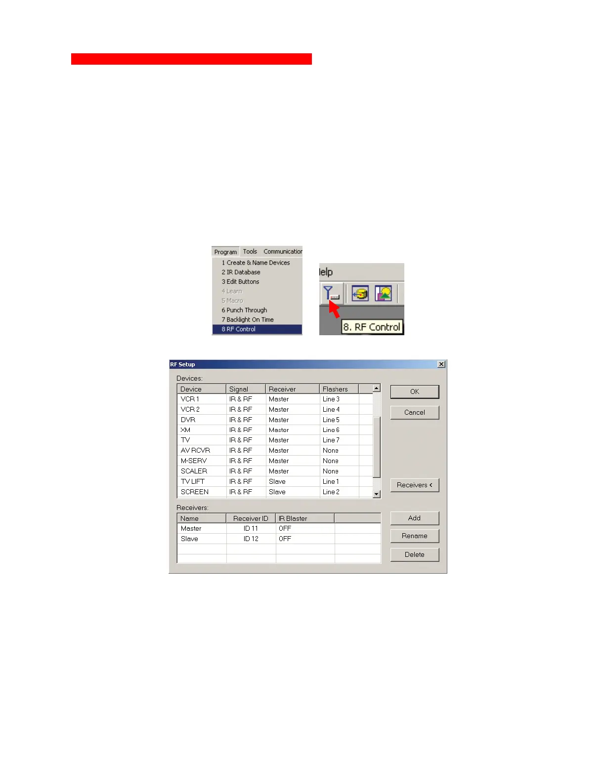 3. In the RF SETUP WINDOW, click the RECEIVERS< BUTTON. The window will expand to show the