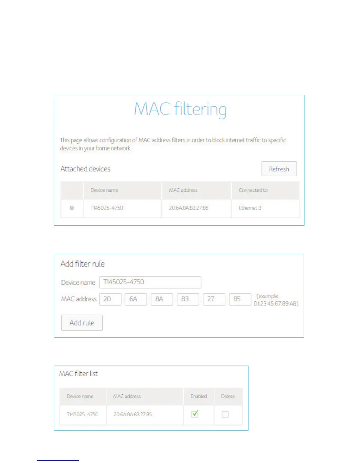This page allows configuration of MAC address filters in order to block Internet traffic to