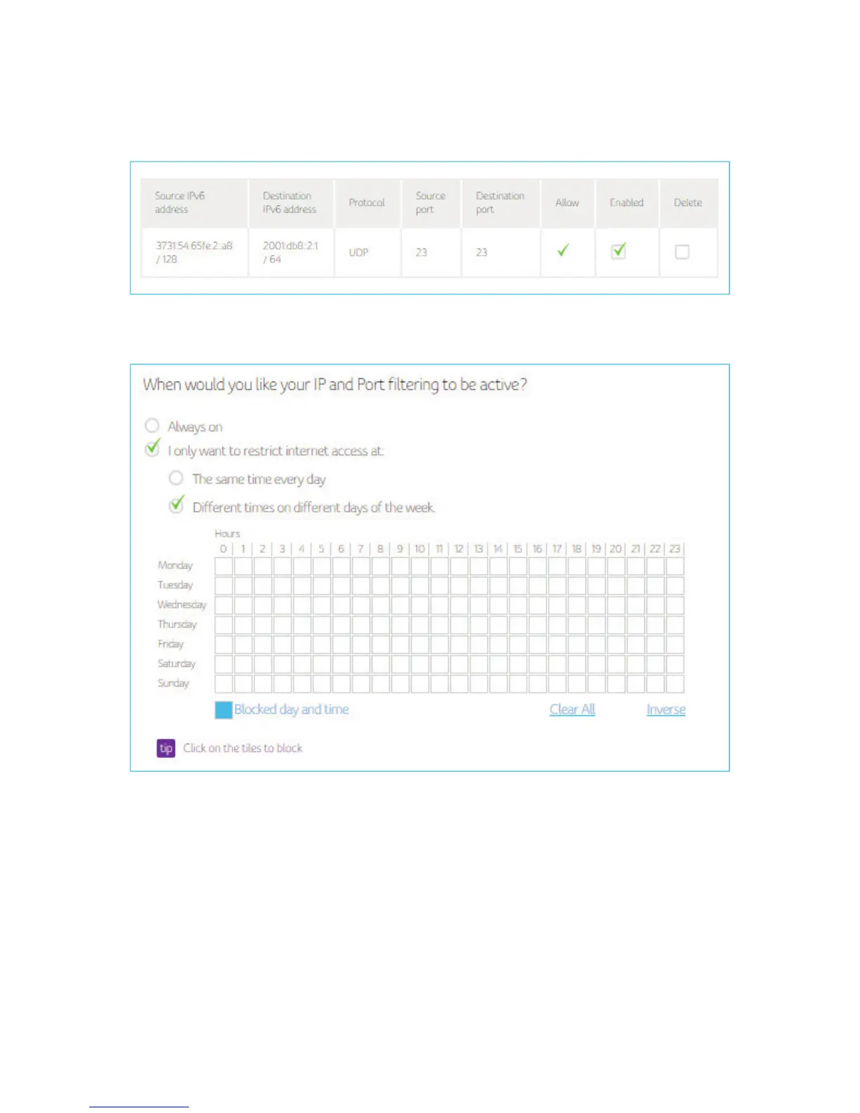 Choose the time period to activate IP and Port filtering