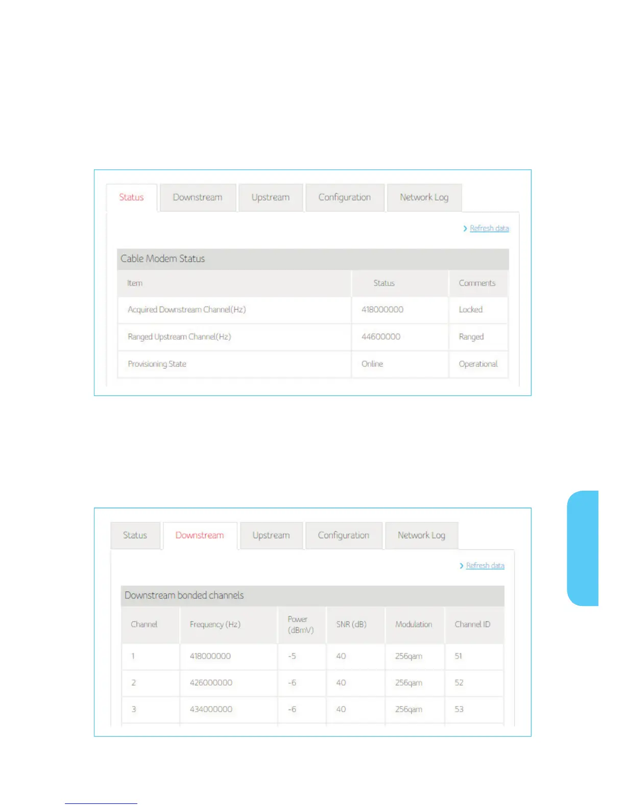 The Downstream bonded channels page is a read-only screen that shows your cable