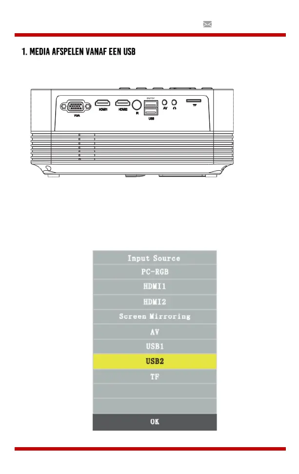 Kies USB 1 (aangetoond als OUT5V) of USB 2 (aangetoond als USB) als bron in het